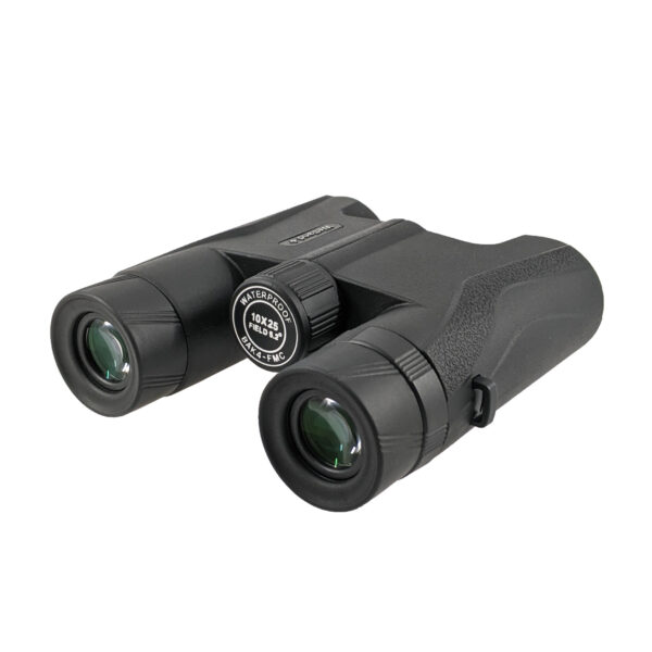 The 10x magnification is powerful enough to see detail but not so powerful that image stability, brightness or colour contrast is diminished. The 10×25 combination also provides a good field of view with a very bright image which is beneficial when tracking moving objects. This light weight compact will out perform many full size binoculars due to the superior optics utilised.